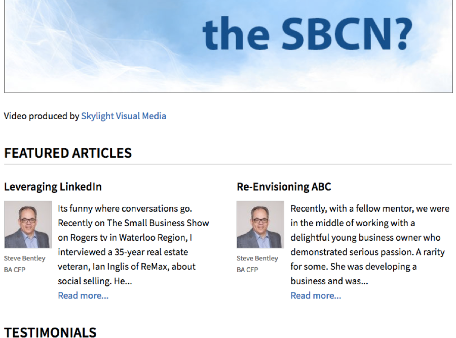 The graphic shows a successful businessman, Steve Bentley, who has paid for SBCN Membership. One of the many benefits offered to members is to showcase their expertise by posting their own articles on the SBCN Home Page. Steve is a consistent contributor, thereby ensuring his face becomes recognized, his brand is memorable and clients know his expertise and how to contact him easily.