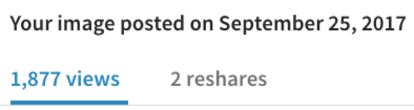 The above shows that I shared an image (with some text) on LinkedIn on September 25th, and so far 1,877 LinkedIn users have viewed my post. There are statistics, which I am not sharing in this post, that share with me the demographics of who checked out my post. This is very useful information for me.